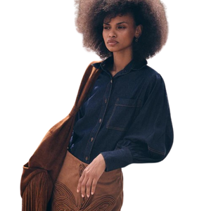 Destacan sus mangas largas abullonadas, con puños amplios y cierre de botones, que aportan volumen y un toque sofisticado al diseño. Bolsillo funcional en el pecho y costuras contrastantes para un look moderno y versátil. Material  en 99% Algodón y 1% Elastano.