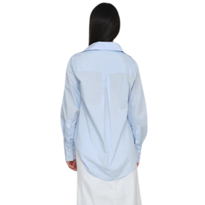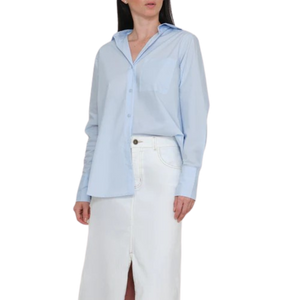 Camisa New Giorgina color  azul, estilo camisera over size, con botones en las  mangas y bolsillo en la parte delantera. Material 100% Algodon.