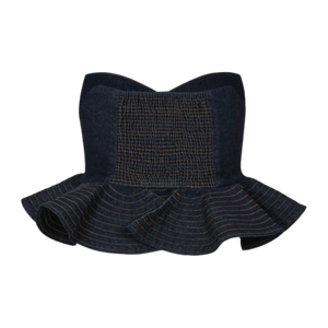 Crop top en denim oscuro con escote corazón y estructura entallada que realza la silueta. Su diseño se complementa con un delicado volante plisado en el bajo, que aporta movimiento y feminidad.  Material en 100% Algodon Denim.