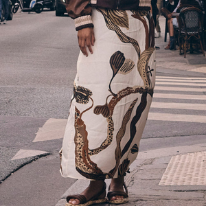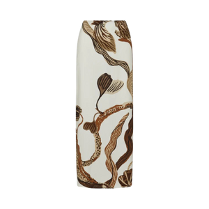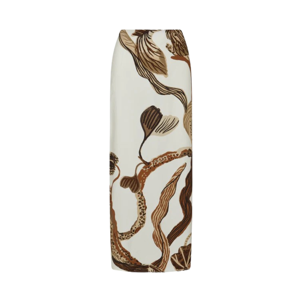 Falda Arabela Ivory Coffee presenta un delicado estampado de orquídeas diseñado exclusivamente por Padova. Este modelo midi incorpora un cierre invisible para un acabado impecable y un elegante corte en la parte inferior trasera, que realza la silueta. Material 100% Viscosa