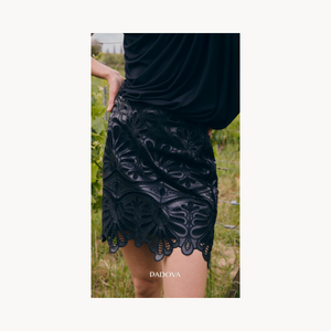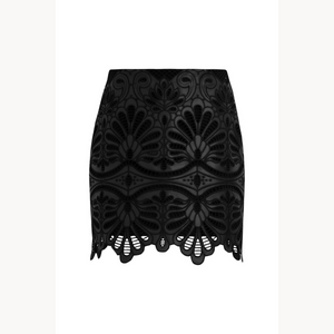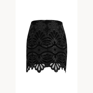 Falda Charlene negro. mini falda, con diseño floral que aporta textura y elegancia. Su silueta estructurada con terminación calada en el ruedo resalta la feminidad de la prenda, ideal para looks sofisticados con un toque contemporáneo. Fit regular. Elaborada en 100% Poliester.