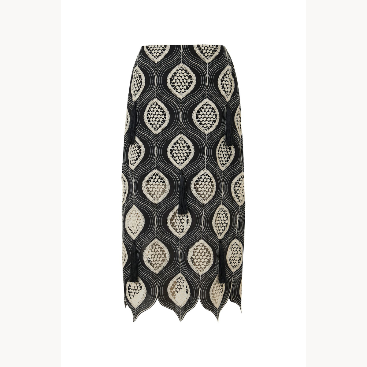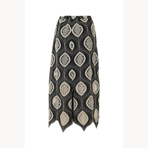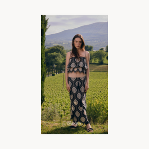Falda Kira negra. Falda de corte recto y confeccionada con un patrón geométrico repetitivo en forma de óvalo. Los colores predominantes son el negro y un tono claro que contrasta para resaltar el diseño. Presenta un terminado en picos siguiendo el patrón del tejido, lo que le da un toque artesanal y bohemio.