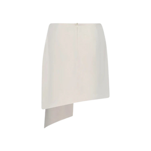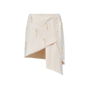 Falda corta asimétrica en tono marfil, confeccionada en un tejido suave y fluido que resalta su estructura envolvente. Su diseño cruzado aporta movimiento y modernidad, mientras los bordados artesanales con mostacillas añaden un toque de brillo sutil y sofisticación. Material 97% Poliéster y 3% Elastano, Forro en 100% Rayón viscosa.