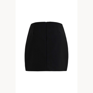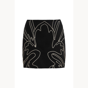 Falda siria bordado negro. Mini falda de tiro medio en tejido plano con silueta ajustada. Su diseño destaca por un bordado lineal en contraste que evoca formas orgánicas, dando un toque gráfico y moderno. Perfecta para looks nocturnos o combinaciones monocromáticas. Fit ajustado. Elaborrda en 100% Lino.