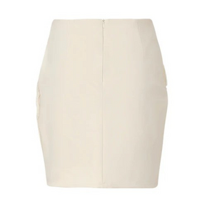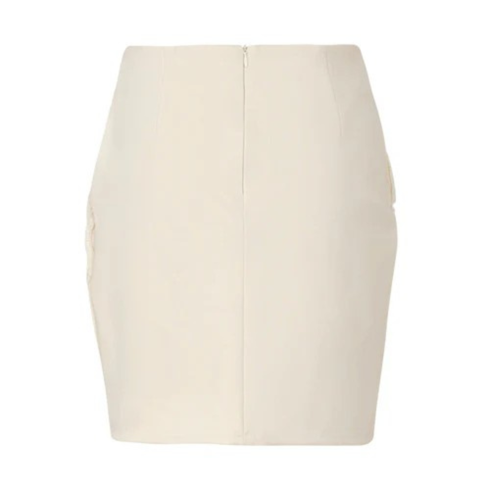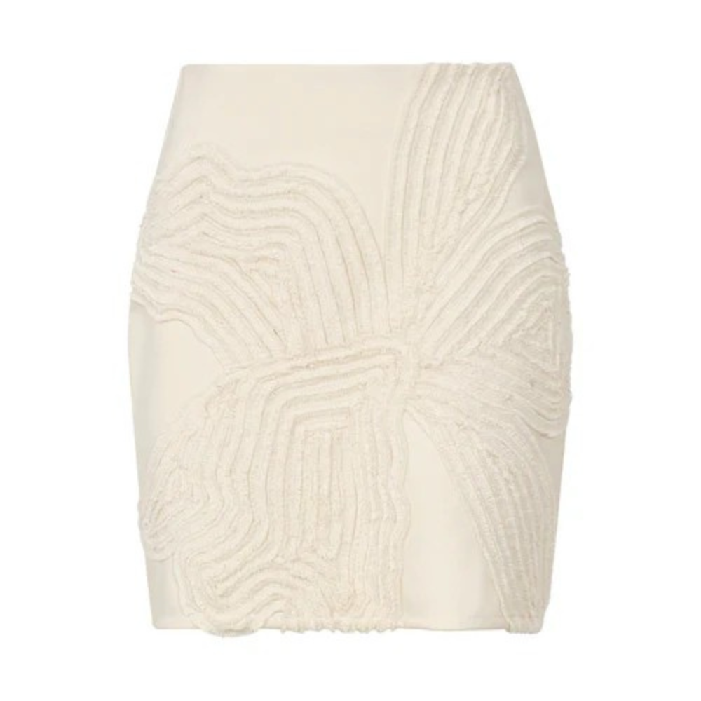 Falda xiao glow vainilla, de silueta ajustada, confeccionada en un tejido estructurado que realza la figura. Presenta un bordado relieve de gran tamaño en forma orgánica que aporta textura y un toque artesanal al diseño. Fit  slim. Material  65% Rayón, 29% Poliamida y  6% Elastano.