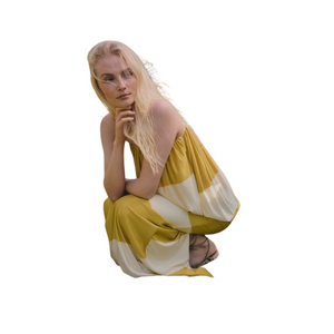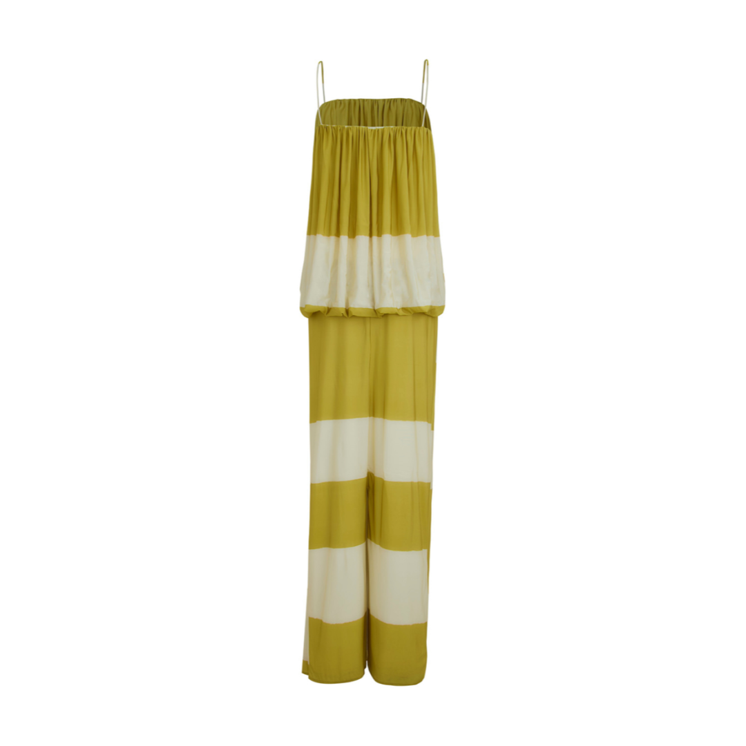 Vestido aleshia natural pistacho. Vestido largo que presenta un juego de rayas horizontales en tonos pistacho y natural, con escote recto y delicados cargaderos. El detalle de blusón superior aporta movimiento y un aire relajado y femenino.