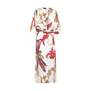 Vestido lírica ivory burgundy. Vestido largo, con caída ligera y movimiento natural. Su estampado con el sello distintivo de Padova. Las orquídeas y los trazos de pincel antiguo en tonos vivos se combinan para crear una pieza única que fusiona elegancia clásica y carácter contemporáneo. Cuenta con escote en V, mangas amplias tipo kimono y cinturón del mismo tejido para realzar la silueta. Fit Amplio. Elaborado en 100% Viscosa.