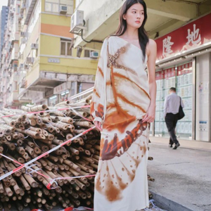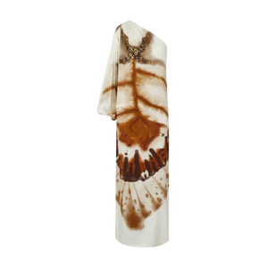 Vestido largo de un solo hombro con silueta fluida y caída elegante. presenta un estampado tipo acuarela en tonos tierra y marfil que se despliega de forma orgánica sobre toda la prenda, evocando un efecto artesanal y natural. La manga larga asimétrica con drapeado sutil añade movimiento y sofisticación. Material 100% Viscosa