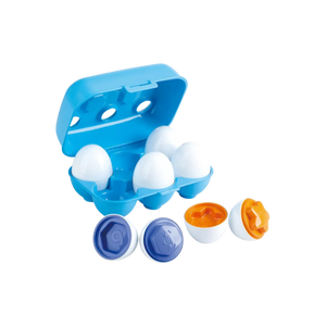 Juego de clasificación con huevos de diferentes formas y colores. Fortalece la coordinación ojo-mano y la motricidad fina del niño. Edad recomendada: a partir de 12 meses.