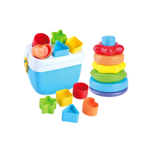 Estimula las habilidades de los bebés con el Juguete para Bebé Apilable Formas. Este set incluye: dos juegos clásicos (pirámide para clasificar aros y caja con tapa para insertar formas). Este divertido juego le enseñará a los pequeños los diferentes colores, formas, clasificación y tamaño a través del juego con aros encajables de diferentes texturas y color. Los chiquitos aprenderán a colocar anillos sobre un soporte, un gran ejercicio que incentiva las habilidades motoras de los bebés. ¡Cómpralo en línea!