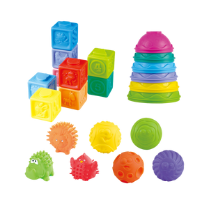 Presentamos el trío de apiladores, bloques y juguetes blandos de PLAYGO! Deja volar la imaginación de tu pequeño mientras disfruta de horas interminables de diversión y aprendizaje. Este encantador trío incluye un apilador, bloques y juguetes blandos que fomentan la creatividad, la motricidad fina y la resolución de problemas.