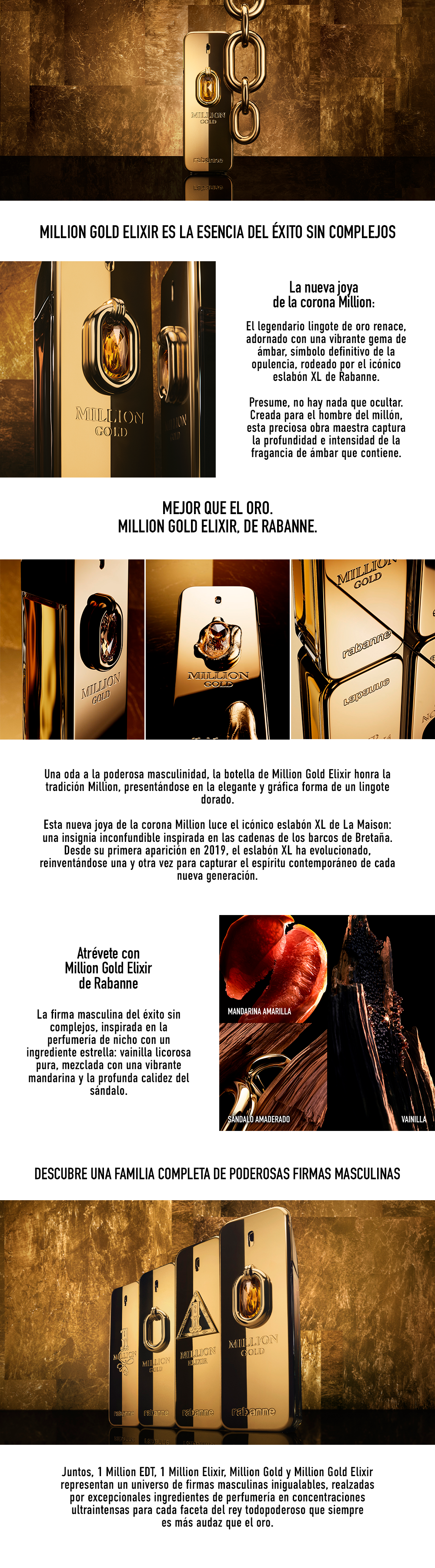 Luce tu brillo con Million Gold Elixir de Rabanne. ¡El oro nunca está de más!Million Gold Elixir Parfum Intense revela una nueva interpretación del ardiente rey Million, que captura el éxito sin complejos. Esdueño de la opulencia. Su aura brilla intensamente mientras todo lo que toca se convierte en oro.Una fragancia inspirada en la perfumería de nicho, con un ingrediente estrella: una vainilla licorosa pura mezclada con una vibrante mandarina y un profundo sándalo.