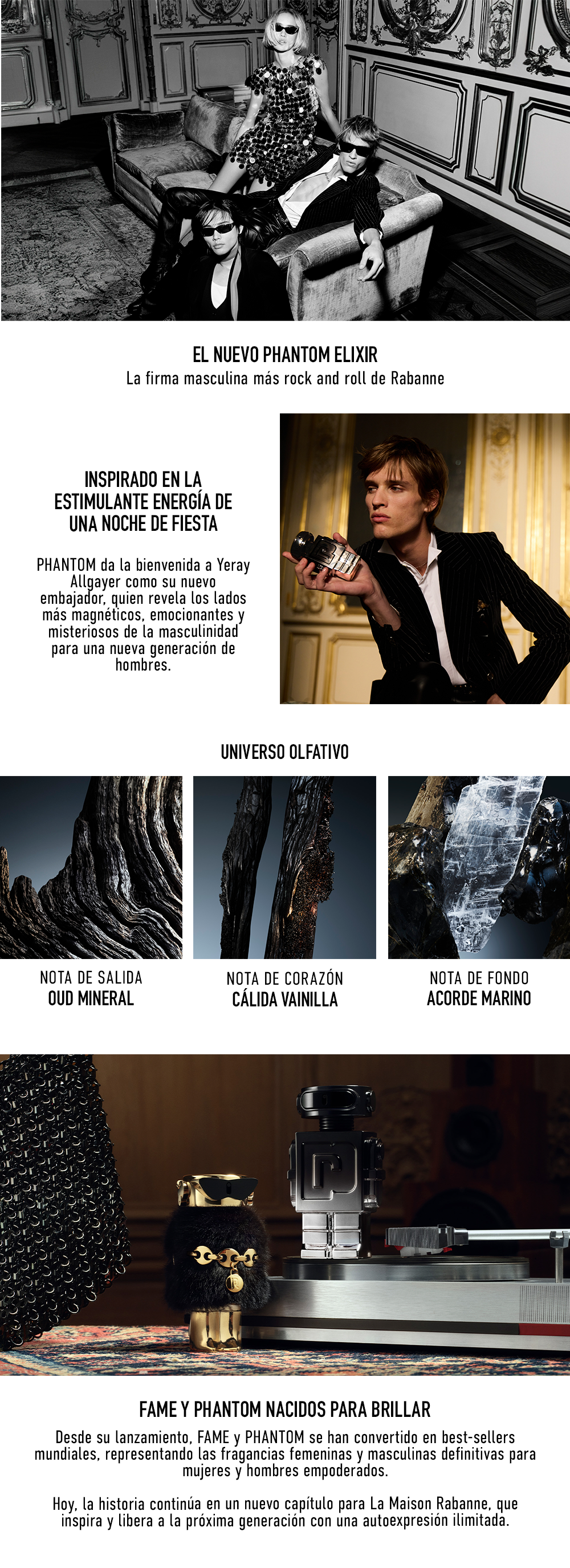Descubre PHANTOM Elixir: la firma masculina más rock and roll de Rabanne.Inspirado en la estimulante energía de una noche de fiesta, PHANTOM Elixir está hecho para el noctámbulo del rock and roll, que vive a su propio ritmo y se deleita con el contraste entre las sombras y la luz.Más intenso que nunca, PHANTOM Elixir es un choque de un fresco acorde marino, un vibrante oud mineral y una cálida vainilla, que celebra la dualidad de la masculinidad Rabanne.