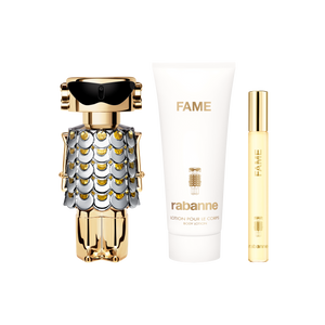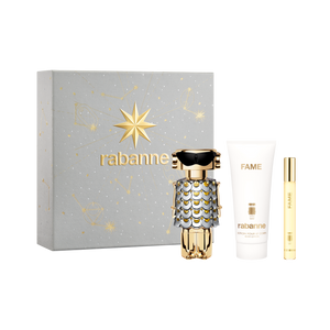 La Maison Rabanne ilumina tus fiestas. Entra en un mundo resplandeciente con este deslumbrante estuche metálico inspirado en el diseño icónico de la Maison Rabanne. Descubre Fame Eau de Parfum 80ml, su loción corporal 100ml y su Megavaporizador 10ml. Quintaesencia del lujo vanguardista, FAME EDP combina la pureza excepcional del jazmín con el suculento mango y el sensual incienso cremoso.