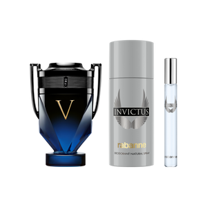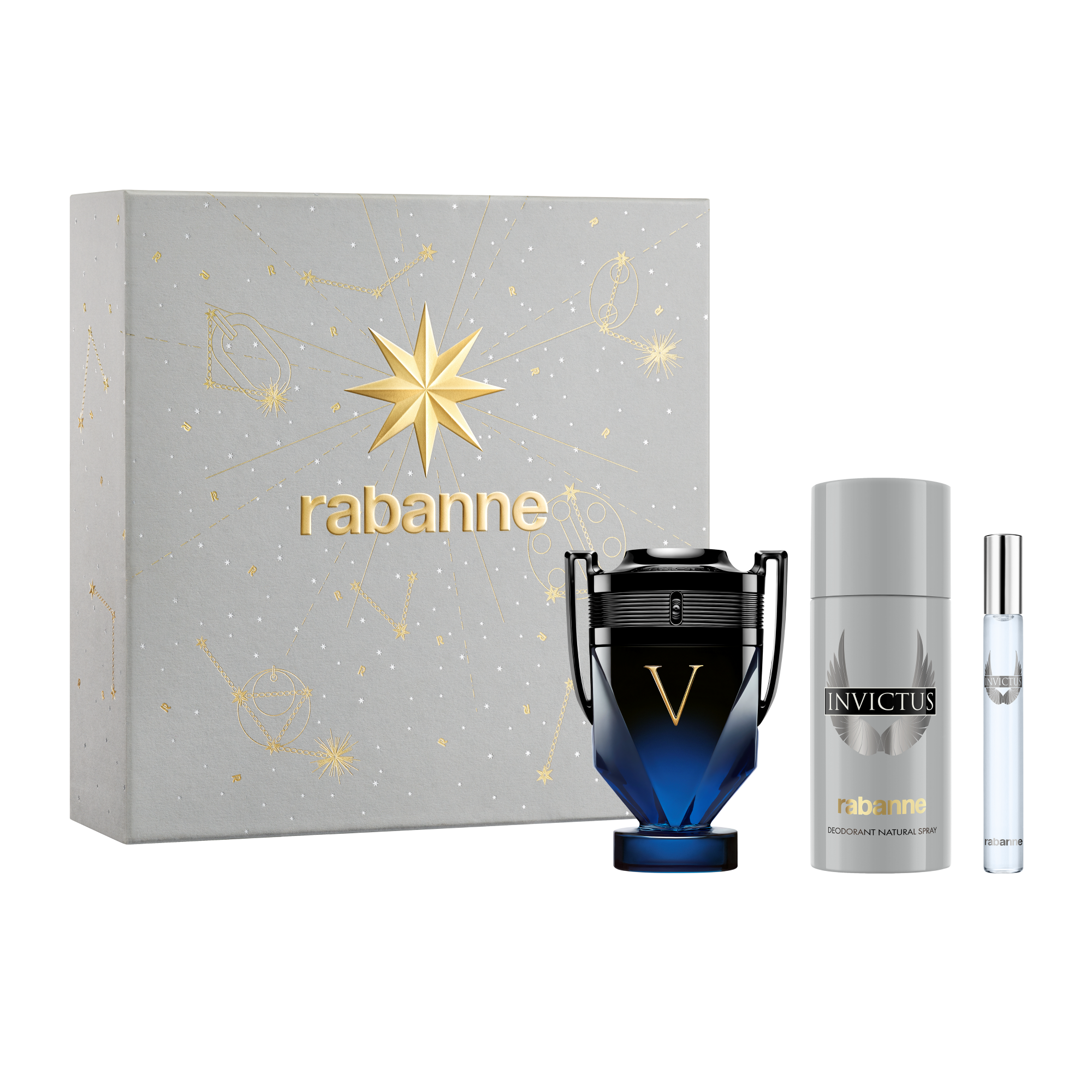 La Maison Rabanne ilumina tus fiestas. Entra en un mundo resplandeciente con este deslumbrante estuche metálico inspirado en el diseño icónico de la Maison Rabanne. Descubre Invictus Victory Elixir Parfum Intense 100ml, su Megavaporizador 10ml y su Desodorante 150ml. Un potente e intenso elixir duradero que combina maderas especiadas y una frescura penetrante para el triunfador épico.