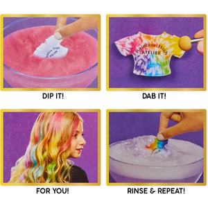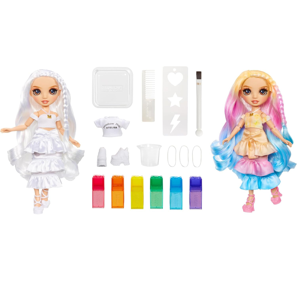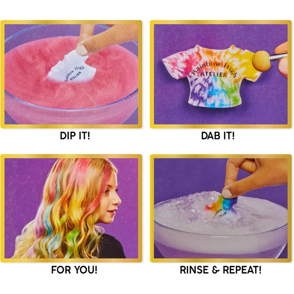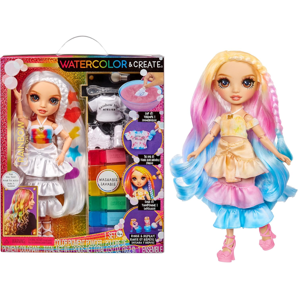 Rainbow High Las muñecas de acuarela y crea moda inspiran creatividad. Watercolor and Create hace que sea tan fácil diseñar tu propia muñeca Rainbow High personalizada de muchas maneras diferentes, incluso Tie-Dye. ¡Incluso puedes usar las acuarelas lavables en tu propio cabello! Luego, simplemente enjuague y repita y vuelva a hacerlo.