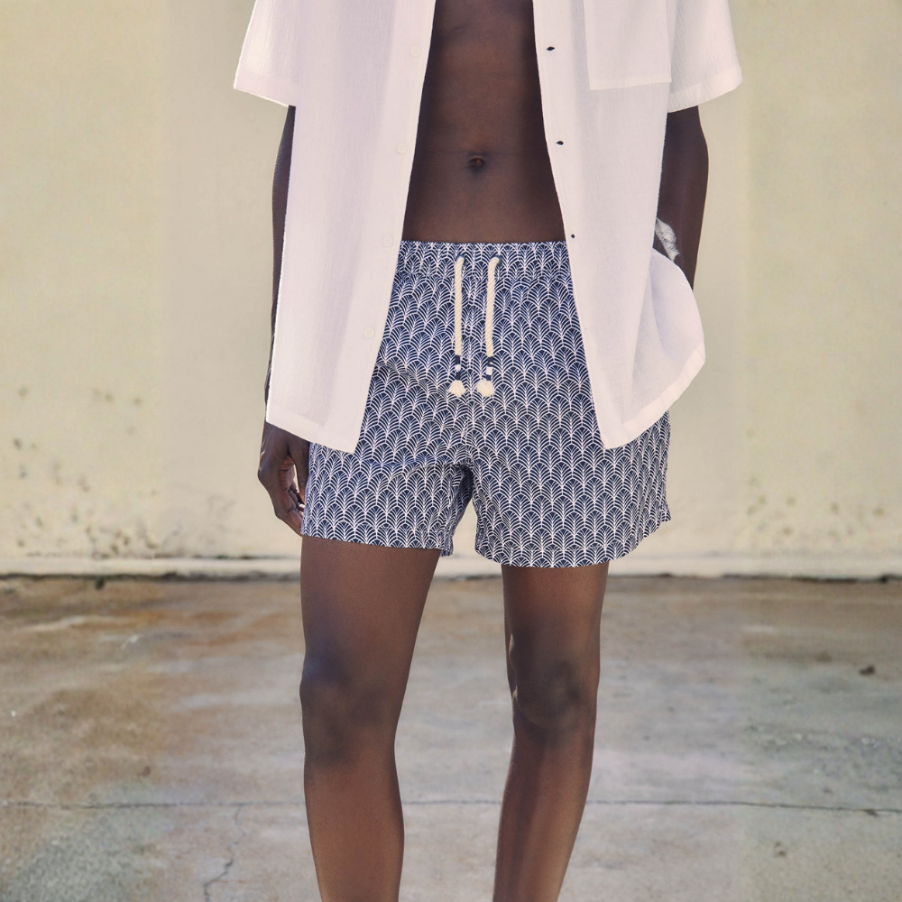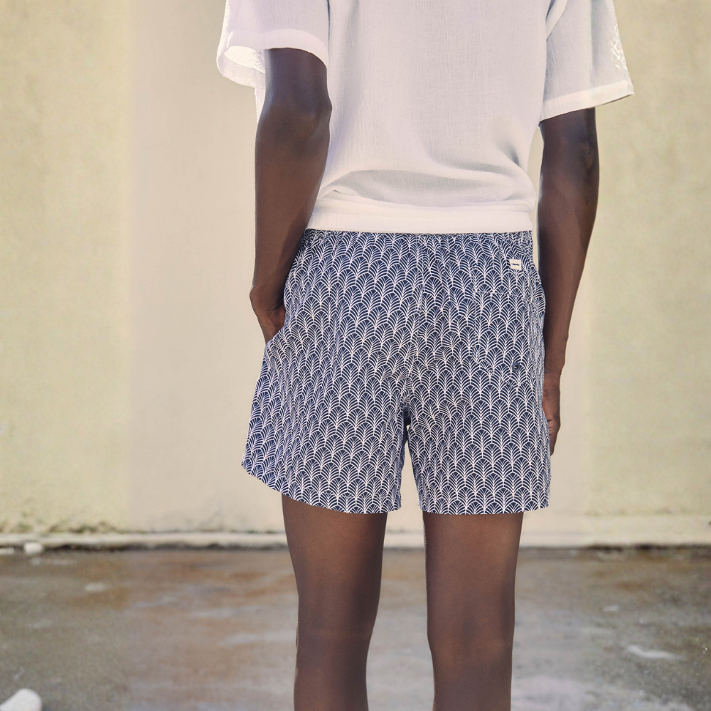 Bañador estampado geométrico. Cintura elástica ajustable con cordón. Bolsillos laterales