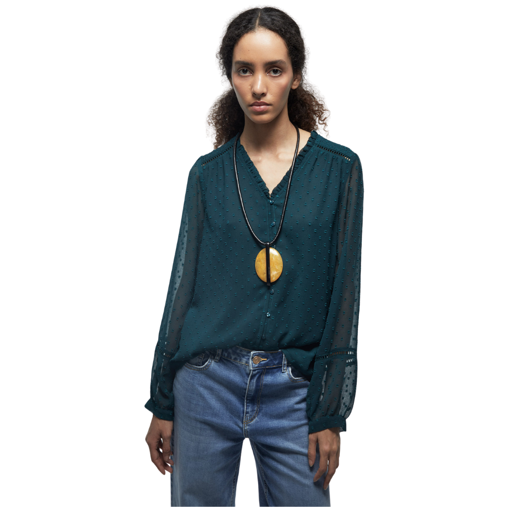 Camisa plumeti de manga larga con detalle de volante en cuello. Cierre de botones.