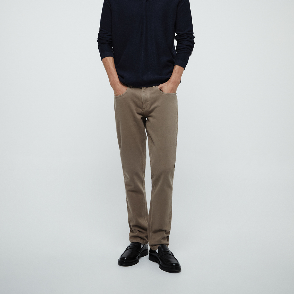 Denim color slim fit con cierre frontal de botón y cremallera. Bolsillos delanteros.
