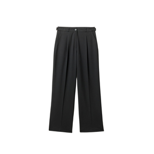 Pantalón pinzas conjunto. Cierre delantero de botón y cremallera. Detalle de hebillas laterales y bolsillos traseros