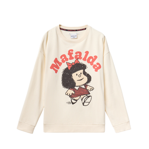 Sudadera licencia Mafalda de manga larga con cuello caja. Detalle de rib en puños, cuello y bajo.