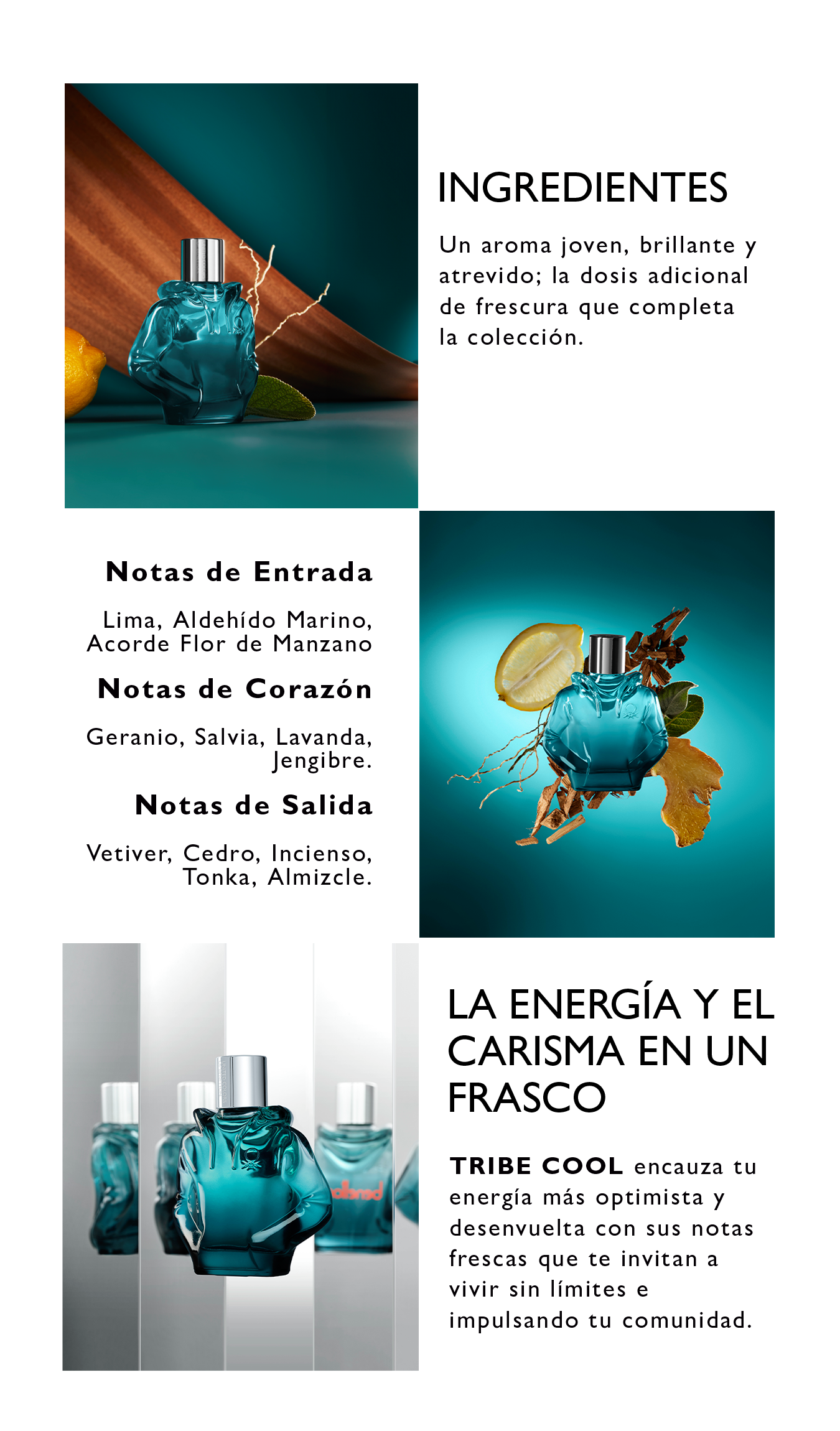 WE ARE TRIBE COOL es el nuevo EAU DE TOILETTE de una generación unida. Una fragancia fresca, vibrante y enérgica que te invita a salir de tu zona de confort. Y a hacerlo muy cool. Familia: Aromática Marina Amaderada . Notas de salida: Lima, Aldeído Marino, Acorde Flor de Manzano. Notas de corazón: Geranio, Salvia, Lavanda. Notas de fondo: Vetiver, Cedro, Incienso